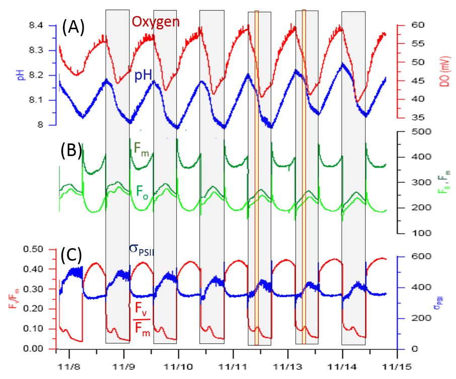 (the sudden collapse and reappearance of the Fv/Fm signal at light-Off and light-On transition,