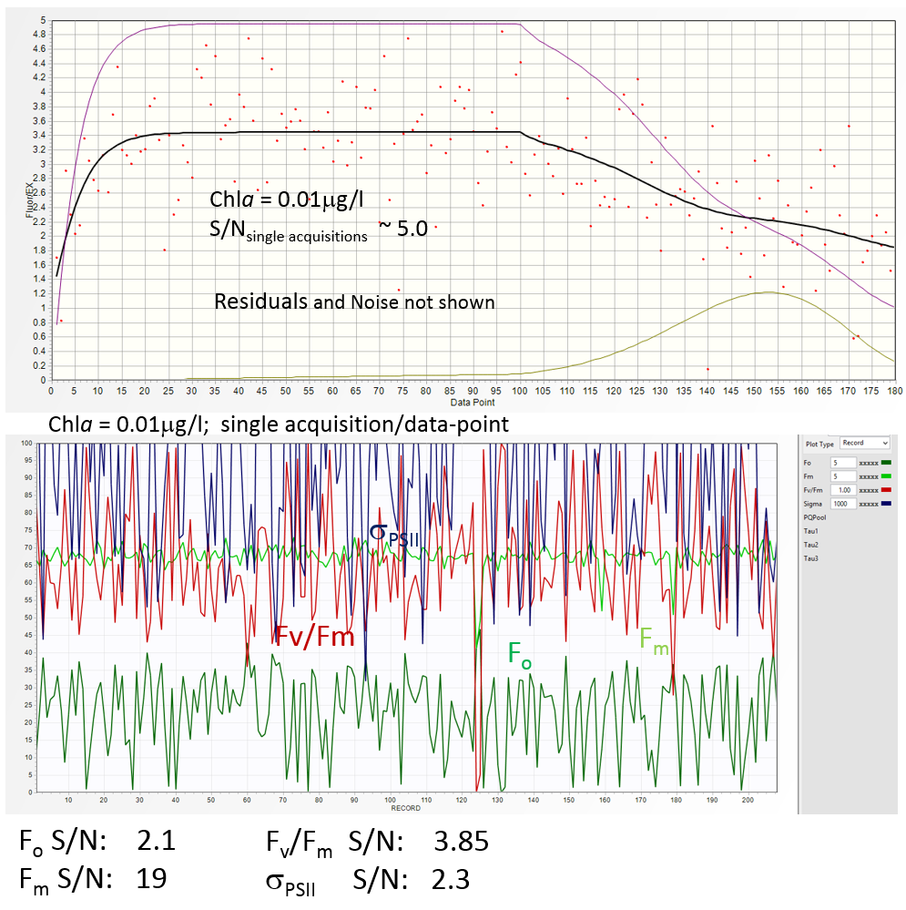(2) This S/N ratio in raw data allows assessment of Fm at S/N ratio of ~19, and assessment of Fv/Fm with S/N of ~3. Robust analysis of other properties, such as functional absorption cross section and kinetics of photosynthetic electron transport at this chlorophyll concentration usually requires averaging of about 30 fluorescence transients, pushing the S/N ration to ~ 30 (see the discussion regarding S/N ratio later on this page).