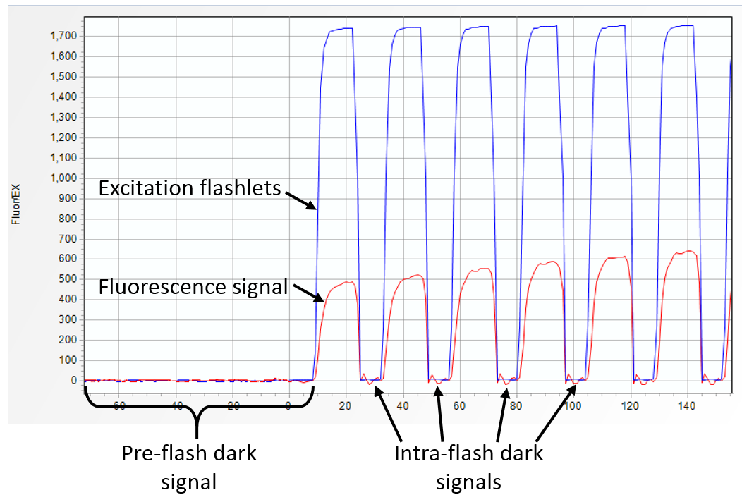 the FRR flashing sequence with control of the ambient light level. Depending on the version of the LIFT/FRR instruments, up to 15 DC illumination channels (five FRR channels, one IR channel, and 8 optional excitation channels)