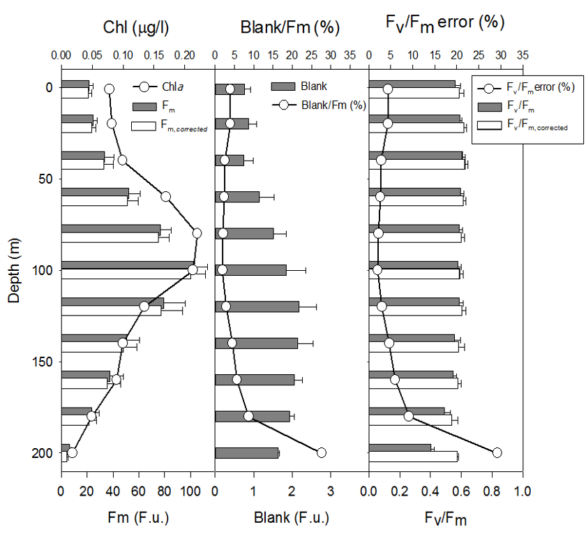 Typical patterns of sample blank distribution in the open ocean water column (600 km east of California Coast) display a minimum at the surface, averaging between 2 to 4% of Fm, increasing