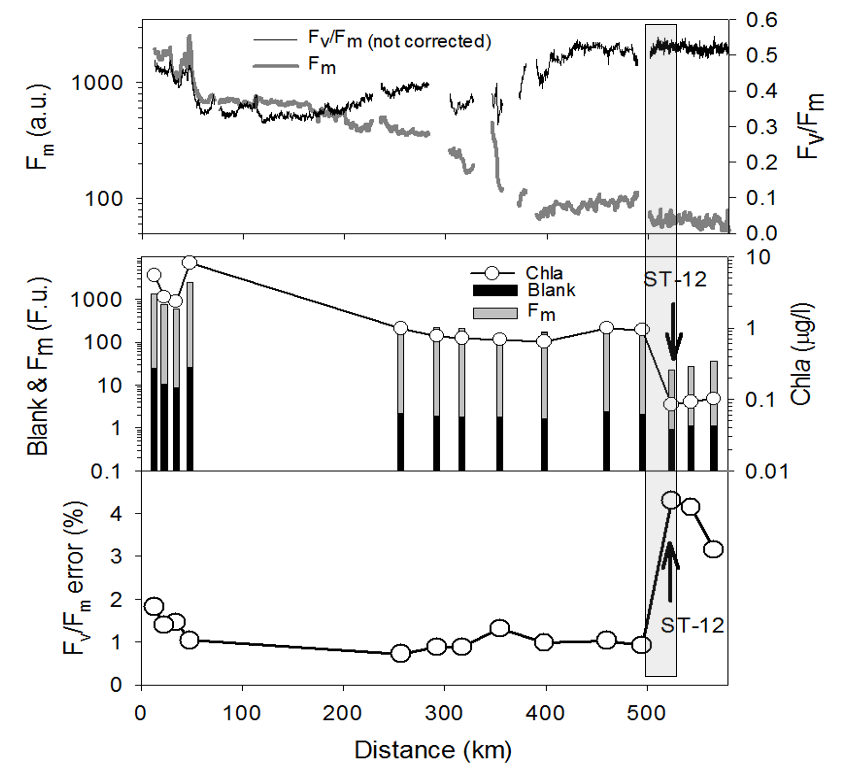 the fitting procedure to calculate Fm. Theoretically, the Fm signal can still be recovered at 20 times lower Chla concentration with some signal averaging. This sensitivity can pushed further by extending the length