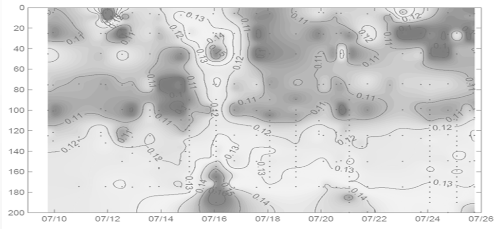 Below the Chlamax, the blanks signal generally stabilize at a level observed at Chlamax position, or decrease with depths down to to 200 meters.