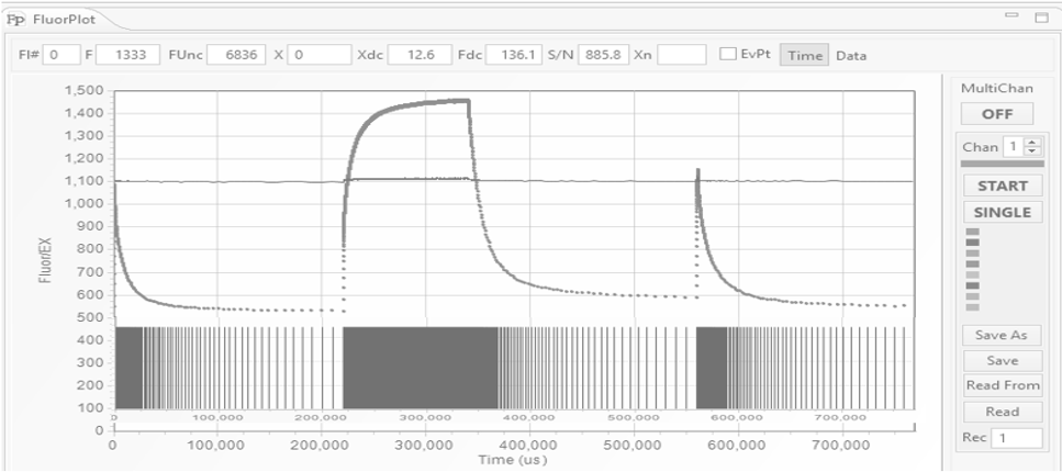 With such S/N in the raw data, the Fm signal is recovered with S/N ratio of about ~19 due to the fact that the entire fluorescence transient, not just the saturation portion, is used in