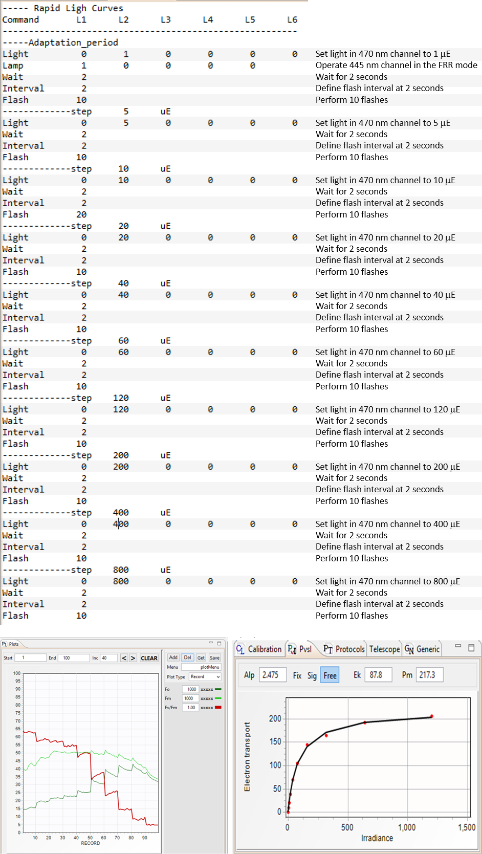 are controlled by these scripts. An example of the kinetics script shown here was used to perform an RLC experiment with results shown below. The initial "dark adaptation" period was performed in presence of μmol quanta m-2s-1 of blue (445nm) nm light