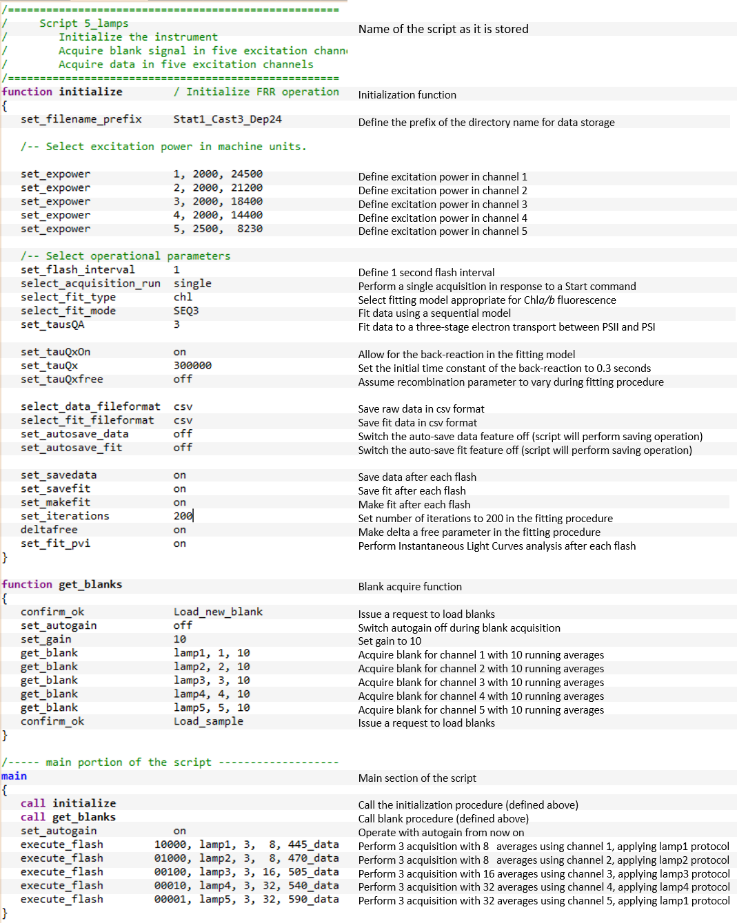 and continuous/indefinite loops of instrument operations. All instrument functionality, including acquisition of blanks and acquisition of fluorescence transients,