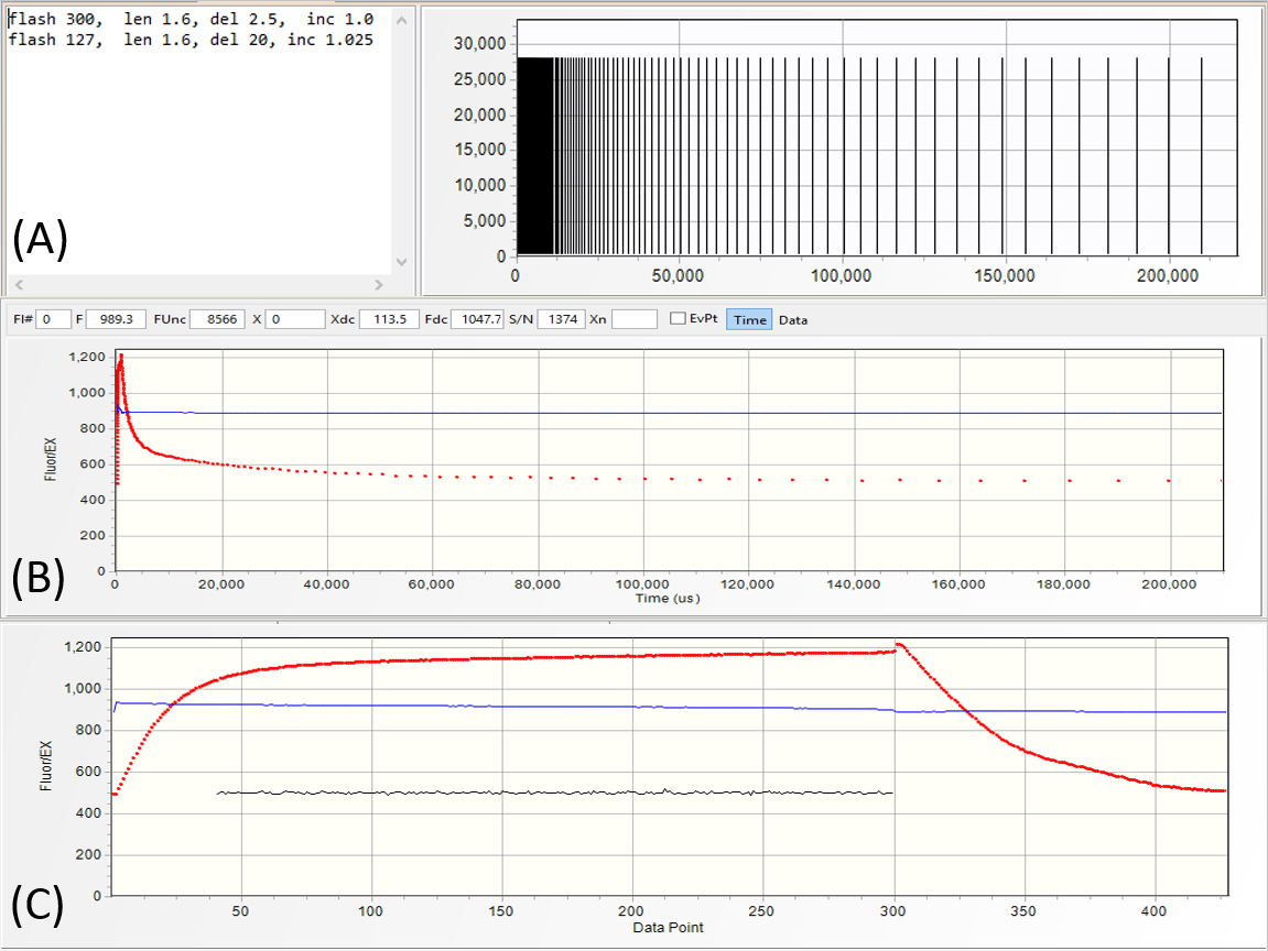 in the graph section of the protocol panel. The fluorescence transient produced by this excitation protocol is shown as a function of time (B), and as a function of flashlet number