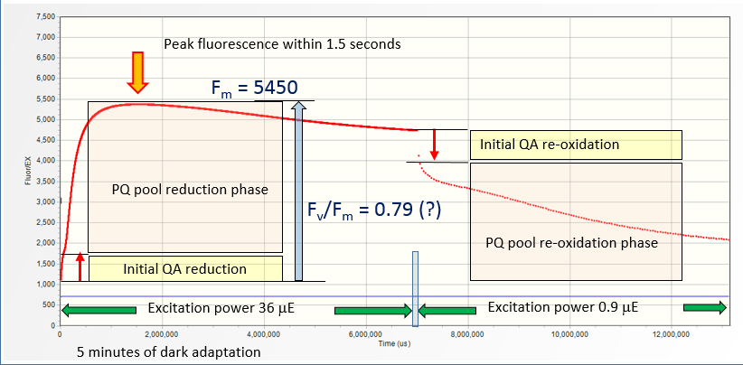 this indicates Fv/Fm of about 0.79 achievable with relatively low excitation power of 36 μmol quanta m-2s-1.