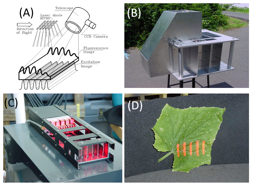 A concept of an airborne LIFT instrument was developed at Rutgers University in 1998 (A). An image of up to 60 stripes is projected over 1 meter x 1 meter area from a mowing airborne platform (B) using an array of laser diodes (C). Flying at speed of about 215 km/hour (cruising speed of Twin Otter airplane), this image creates a periodic excitation signal on the ground (D) over a period of 16 ms. Forty of these stripes are arranged within the first 2 ms of the excitation image, the remaining twenty are spaced along the next 14 ms to produce saturation/relaxation excitation sequence. A red-sensitive camera equipped with 250 mm telescope system and a synchronous shutter acquires a "static" image of the produced fluorescence pattern. When flying above a homogenous target, the static fluorescence image can be integrated by the CCD camera over a period of several hundred ms to build up the S/N ratio. The prototype LIFT system (A) was built and was equipped with 12 excitation modules, each containing 5 individually-adjustable laser diodes (B and C). The system was ground-tested at a distance of up to 196 meters (E). The laser excitation source was designed to operate in the DC mode for 60m/s moving airborne platform, and in the pulsed mode for a static (helicopter-based) airborne platform. A mounting plate for NASA Twin Otter plane was designed, and preliminary cleared by NASA engineers. Regretfully, the project was terminated before flight tests. The development effort was led by Zbigniew Kolber, currently at Soliense Inc. The mechanical, optical, and most of the electrical design of the airborne LIFT instrument was done by Denis Klimov, currently an engineer at Monterey Bay Aquarium Research Institute.