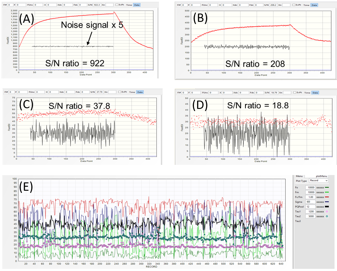 The fluorescence transient above was acquired on the leaf of young lemon tree at a distance of 80 cm with exceptionally low noise (the black trace, amplified by a factor of 5) and high S/N of ~1490.