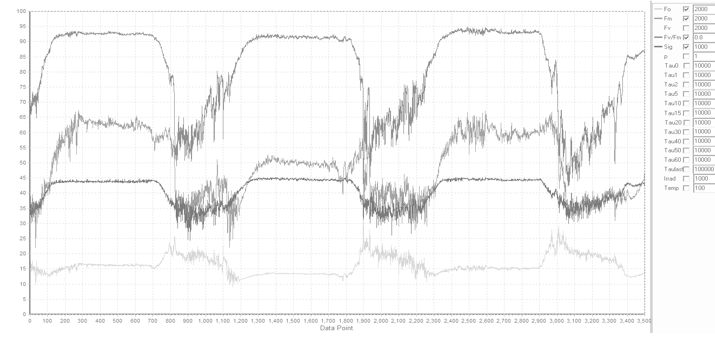 This experiment, performed with cottonwood tree yielded somewhat different result, where the post-illumination Fv signal, not the