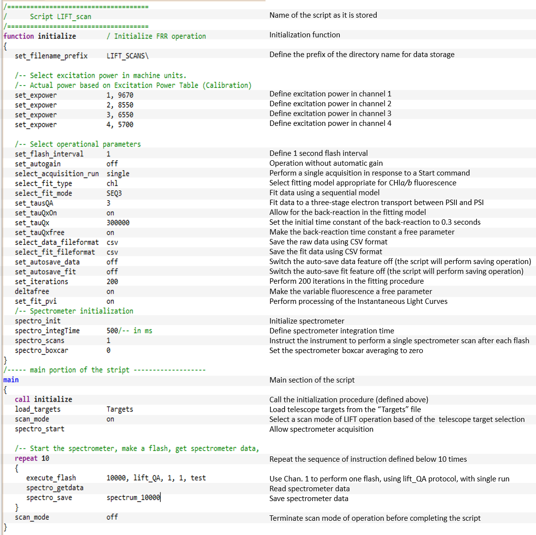 data processing, spectrometer operation, and telescope operation can be programmed using execution scripts. An example of the LIFT script presented above is used to perform a series of measurements