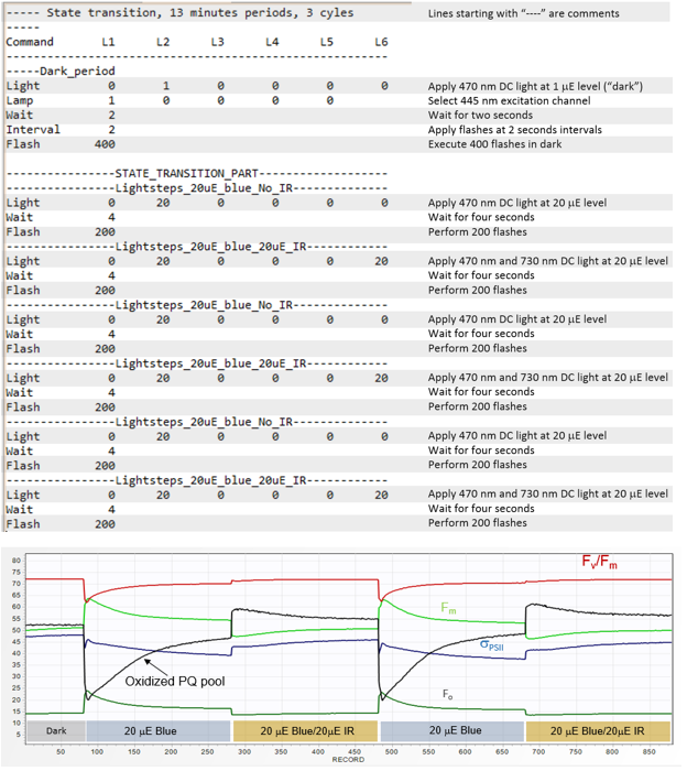 assessing the extent and the dynamics on nonphotochemical quenching, and State Transition experiments. The example kinetics script shown here was used to perform State Transition experiments on Parsley leaves,